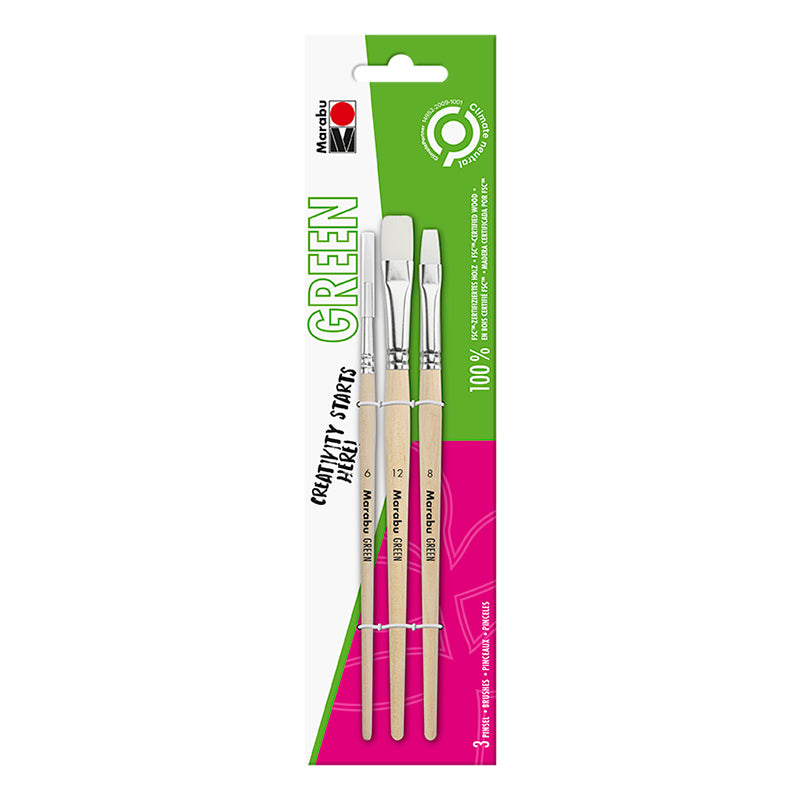 Marabu Green siveltimet on valmistettu 100% FSC sertifioidusta puusta ja varsi on käsittelemätön. Vegaaniset harjakset. Soveltuu mm. akryyli- alkydi- kangas ja akvarelliväreille. Pakkaus 100% kierrätettävä.