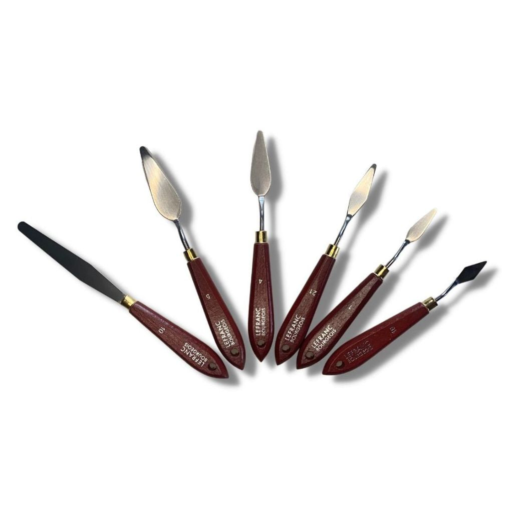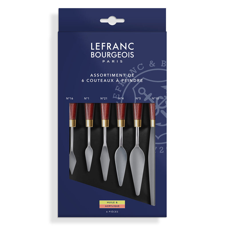 Laadukkaat Lefranc & Bourgeois palettiveitset kätevänä lajitelmana. Kuuden veitsen lajitelma sisältää palettiveitset n°1, n°4, n°5, n°16, n°21, n°10. Puuvarsi, metalliterä. Soveltuu öljy- ja akryyliväreille, erilaisille pastoille sekä kaikenlaisiin luoviin maalausmenetelmiin.