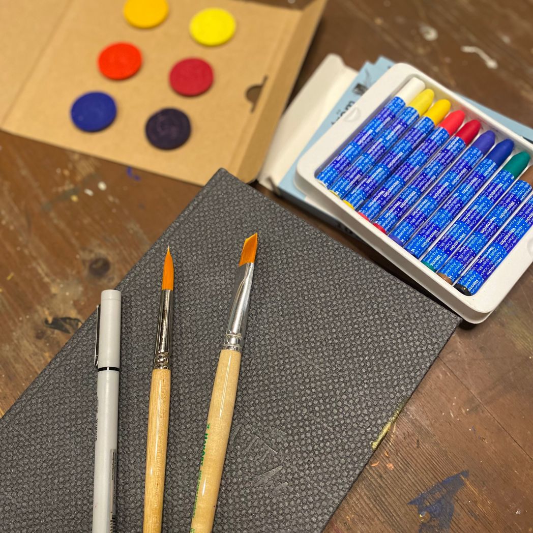 Taidepäiväkirja Akvarelli -verkkokurssia varten suunniteltu korkealaatuinen materiaalipaketti.