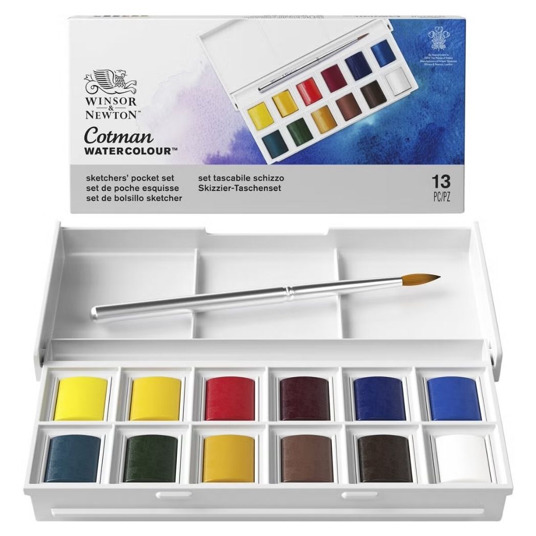 Rasia sisältää: 1 x siveltimen, 12 x Cotman 1/2-värinappia seuraavilla sävyillä: Lemon Yellow, Cadmium Yellow, Cadmium Red Pale Hue, Crimson Alizarin, Ultramarine, Intense Blue, Emerald Green, Sap Green, Yellow Ochre, Burnt Sienna, Burnt Umber, China White.