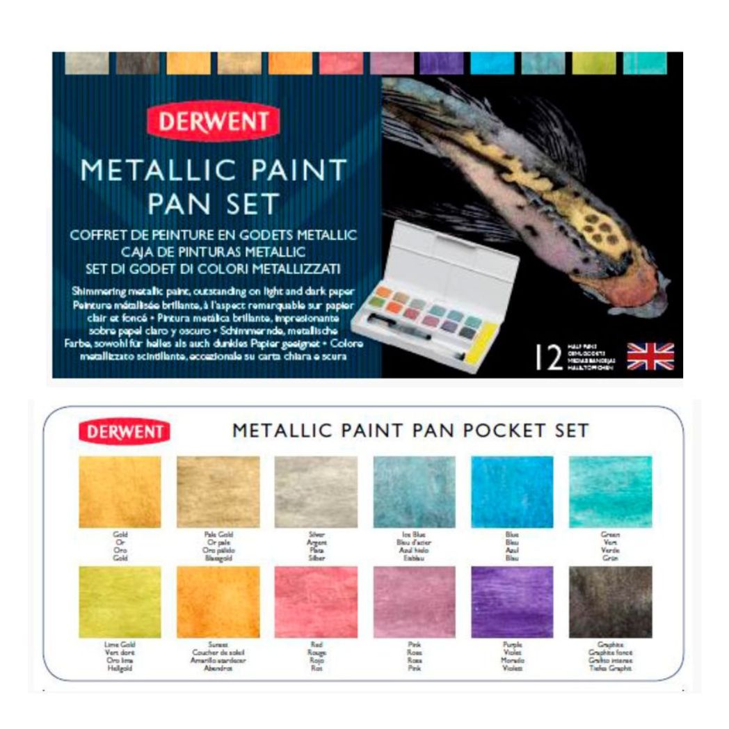 Derwent Metallic Watercolor Pan set tarjoaa täydellisen väripaletin, jossa sekoittuvat upeasti metallinhohto ja grafiitin sävyt!